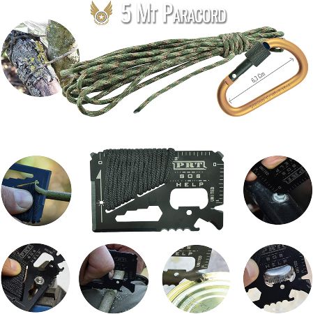 - Cuerda de PARACORD: dispone de 5 metros de esta cuerda que fue originalmente diseñada para los paracaídas y de la cual puedes hacer un gran uso y obtener diferentes beneficios.